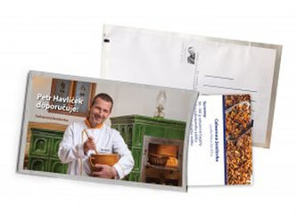 Pohlednice ve tvaru obálky z tvrdého papíru s dárkem uvnitř. Rozměry: 18,5x11 cm. Obsah: magnetka s receptem Petra Havlíčka Celozrnná žemlovka