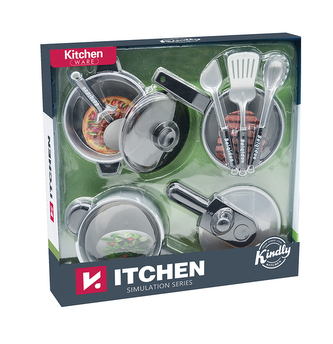 Sada plastového nádobí obsahuje hrnec, tlakový hrnec, pánev, pokličku, kráječ na pizzu a kuchyňské náčiní.