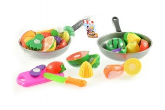 Krájecí potraviny s pánví jsou vhodné pro holčičky, které si rády hrají na kuchařky nebo prodavačky. Zvláštností této sady je to, že je spojeno na suchý zip, a tak se může nakrájet i bez nože. Proto nehrozí žádné zranění. Krájecí ovoce či zelenina je uložen v pánvi o délce 30 cm. Vyrobeno z kvalitního a odolného plastu.\nVhodné od 3 let.