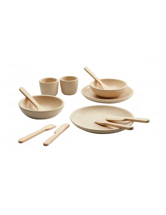 S tímto skvělým nádobím od firmy Plan Toys půjde vašim malým kuchařům příprava jídla sama.\n\nProbuďte ve vašich dětech vášnivé kuchaře a mistry etiky s nádhernou sadou nádobí. Děti si procvičí motoriku, koordinaci, potrénují představivost a fantazii a zlepší své sociální vnímání.\n\nSet obsahuje 2 talíře, vidličky, lžíce, nože, šálky a misky. \n\n\nPlan Toys je již 30 let úspěšně fungující firma v oboru výroby vysoce kvalitních ekologických hraček.\nFirma vznikla v roce 1981 na jihu Thajska a v této oblasti funguje dodnes. Ve své produkci využívá dřevo z kaučukovníků, které již neprodukují latexové mléko. Společnost toto dřevo vykupuje od farmářů, pro které již nemá žádnou hodnotu, ale rovněž dbá na to, aby byly opětovně vysazovány stromy nové. Právě použitím těchto stromů, je výroba trvale udržitelná, ekologická a navíc z vysoce kvalitního materiálu. Výrobní proces je navržen tak, aby se za využití solární energie a biomasy maximálně šetřila energie a nedocházelo k žádné produkci odpadu.\nPlanToys používá ve své výrobě hraček lepidlo bez formaldehydů a barvy na vodní bázi, které jsou bezpečné, bez olova a jiných těžkých kovů. Pro obaly a tištěné materiály se využívá recyklovaný papír. Hračky mají certifikát FSC (pro ekologicky šetrné, sociálně prospěšné a ekonomicky životaschopné obhospodařování lesů) a ISO 9001 (pro vysokou kvalitu produktů) a 14001 (management životního prostředí).\nFirma získala akreditaci o sociální odpovědnosti (OHSAS 18001), což vypovídá o perfektním vztahu k zaměstnancům a vytváření bezpečného a zdravého pracovního prostředí. Firma zaměstnává mimo jiné také osoby se zdravotním postižením, pravidelně sponzoruje mnoho aktivit pro děti, jako jsou dětské kluby, hřiště, knihovny a herny, ale dokonce i spolupracuje s maminkami dětí s různým postižením a spolu s nimi vytváří hračky, které mohou těmto dětem pomoci.\nHračky od PlanToys podporují hru, kreativní mysl a učí děti o světě kolem nás. O jejich úspěchu vypovídají také desítky ocenění z celého světa.