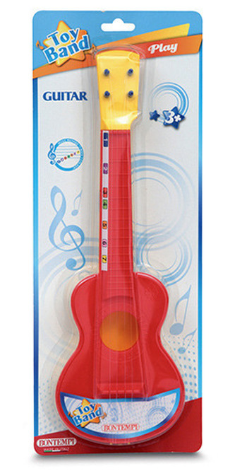 Kytara „Španělka“ plastová červená se 4 nylonovými strunami.\nTrsátko přiloženo. Velikost kytary 40 cm. Vyrobeno v Itálii.