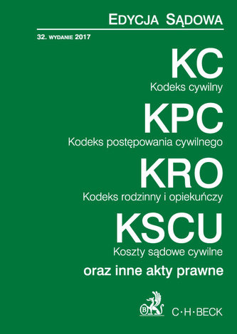 KC. KPC. KRO. KSCU. Edycja Sądowa zawiera: Kodeks cywilny, Przepisy wprowadzające Kodeks cywilny, Kodeks postępowania cywilnego, Przepisy wprowadzające kodeks postępowania cywilnego, Ustawę o księgach wieczystych i hipotece, Kodeks rodzinny i opiekuńczy, Ustawę - Przepisy wprowadzające Kodeks rodzinny i opiekuńczy, Ustawę o kosztach sądowych w sprawach cywilnych, Prawo prywatne międzynarodowe.